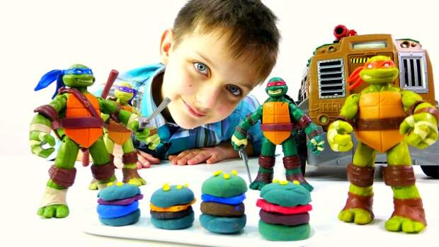 Новое видео для мальчиков с Егором и Черепашками Ниндзя. Микеланджело хочет сделать сюрприз для своих друзей черепашек. Вместе с Егором они распакуют набор для приготовления гамбургеров из пластилина. Тут есть всё что нужно: формы для гамбургеров и хот догов, тарелки, масса для лепки разных цветов и скалка.