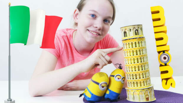Подружка Саша и миньоны играют и отгадывают загадки. Что же в Италии стоит под наклоном? Отгадали? Теперь собираем из картона 3д модель Пизанской башни. Всего то 8 этажей из 13 деталей. Соберем объемную модель пизанской башни вместе с Сашей и миньонами. Смотри видео и увидишь что у нас тобой получилось.