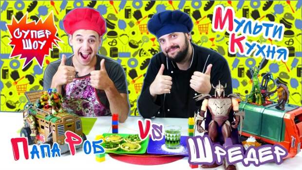 Кулинарное ШОУ Мульти Кухня представляет видео для детей с игрушками из мультфильма ЧЕРЕПАШКИ НИНДЗЯ. К Супер Повару пришел Папа Роб из ПАПА ТАЙМ. Его соперником на кулинарном ринге сегодня будет Супер Злодей - Шредер! Папу Роба поддерживают Черепашки Ниндзя, а Шредера его злобные приспешники. Продукты в грузовичках уже подъехали к рингу и выбран дополнительный ингредиент!